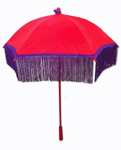Here it is...The most perfect red and purple parasol! Red nylon top, purple trim and fringe. Red rose accent on top, with a red pole! Measures 24" wide, 30" tall when opened. Absolutely Fabulous, Must Have!
