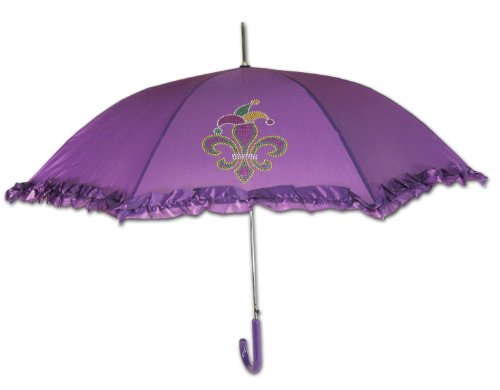 Add some flair to your outfit with this stunning umbrella. The design is composed entirely of sparkly rhinestuds. The fleur de lis is in green, gold and purple mardi gras colors! It features an automatic opening, full curved handle and a ruffled edge. Measures 35 inches high. 42 inches wide.